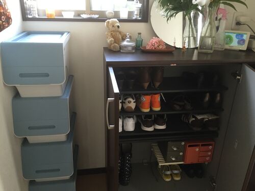 ぱっと見変化わかりにくいかもですが、多少変わりました!w あと靴も少し処分しました。年に数度しか履かない靴とかってみんなは収納どうしているのだろう…と思うほどに我が家は靴箱の収納量が少ないです>< 色々なツールを入れているロフトで買った箱です…