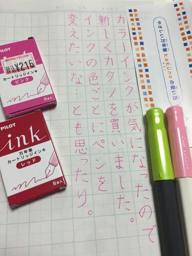 カクノはパイロットのお手軽万年筆 1000円程度の価格で、普段使いに使うにもってこい。というこのカクノ。カラーインク用にもう一本買い足したいな…と思ってピンクキャップのものを買い足しました。 ということで買ってすぐに試し書きしました。ピンクです。…